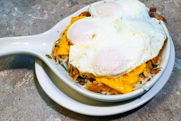 Served with hash browns, English muffin, raisin toast, biscuit, white or wheat toast.